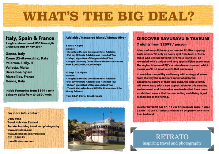 If you’ve got itchy feet like me, here are some tour packages put together by Retrato and Travel Hub NZ.